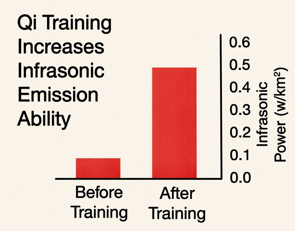 Each of our participants entered their huge anechoic chamber to have the strength of the infrasonic signals from their hand. The instruction was “Imagine a patient needing healing is in front of you and send healing energy from your hand to them (into the microphone)”. The strength and frequency of the measured signal was recorded. Then we embarked on a 10 day medical qigong training at a military paralysis hospital specializing in Qigong. After completion of training, we returned to the National Standards Lab and were tested again. We discovered that the power of the Infrasonic sound from the hands of our group went up by a factor of FIVE!!!